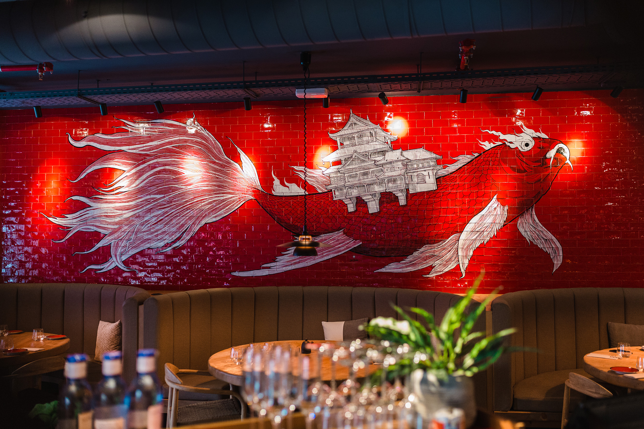 Después llegó Kasa Japo, con luminarias de vaporeras de bambú y paredes con la gran carpa pintada a mano por Jav Rubin, reforzando la identidad de la marca.
