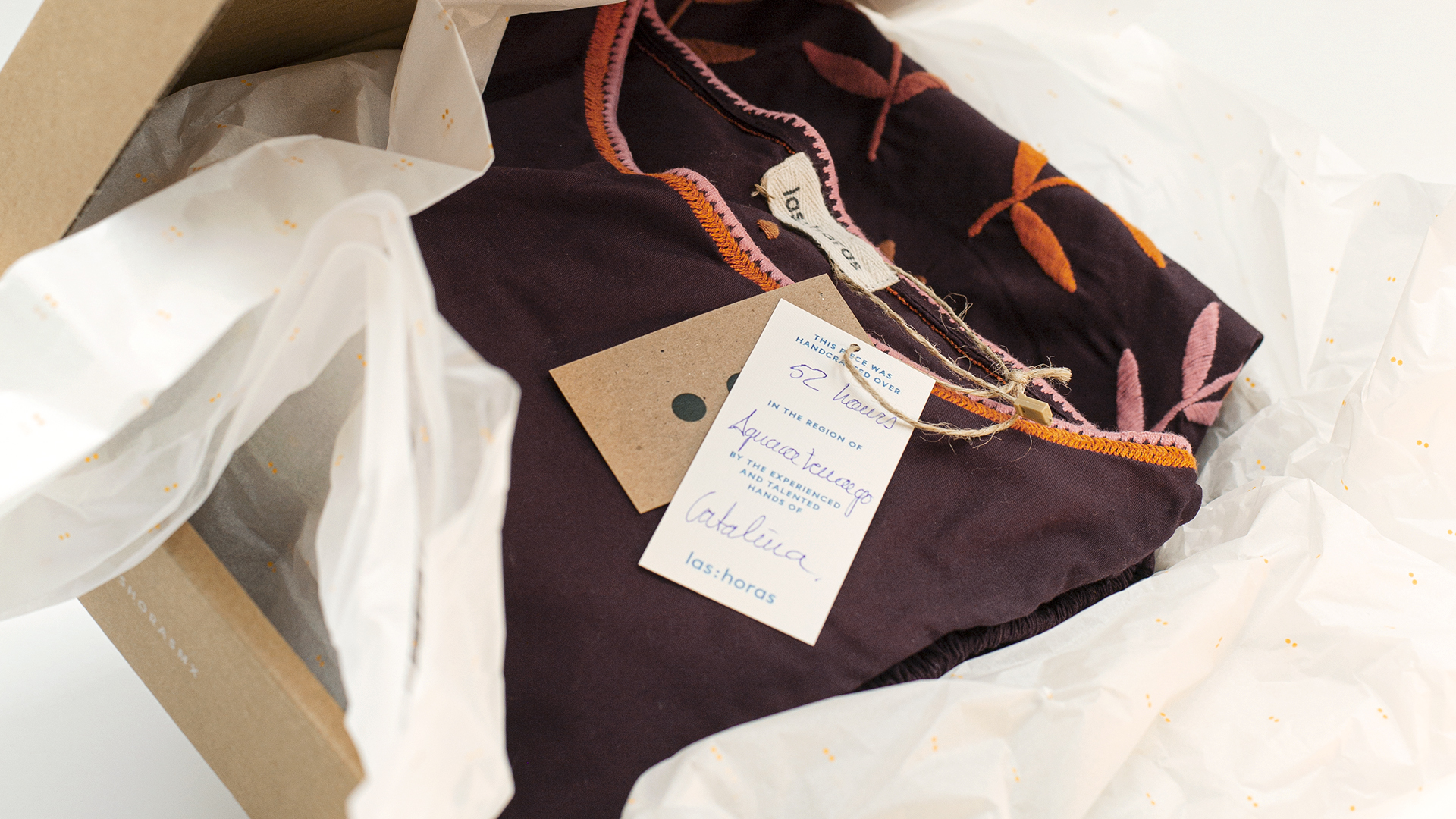 El valor de cada prenda va mucho más allá de su planteamiento creativo. La singularidad nace del proceso manual, del cuidado por el detalle, del saber hacer y del tiempo real dedicado a cada pieza. Las Horas pone el foco precisamente ahí: en el esfuerzo y la dedicación de las artesanas. Una idea que no solo da nombre al proyecto, sino que también se hace visible en pequeños gestos, como el diseño de las etiquetas, donde ese reconocimiento queda explícitamente presente.