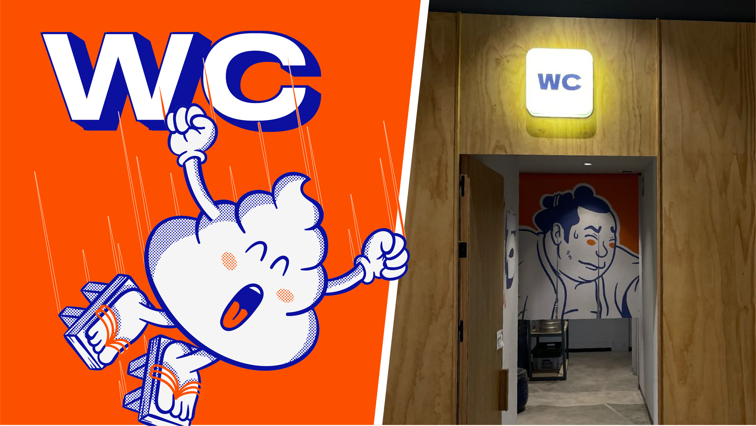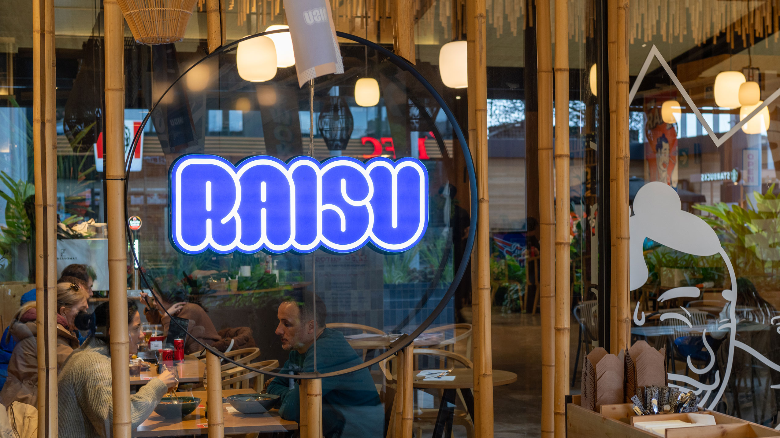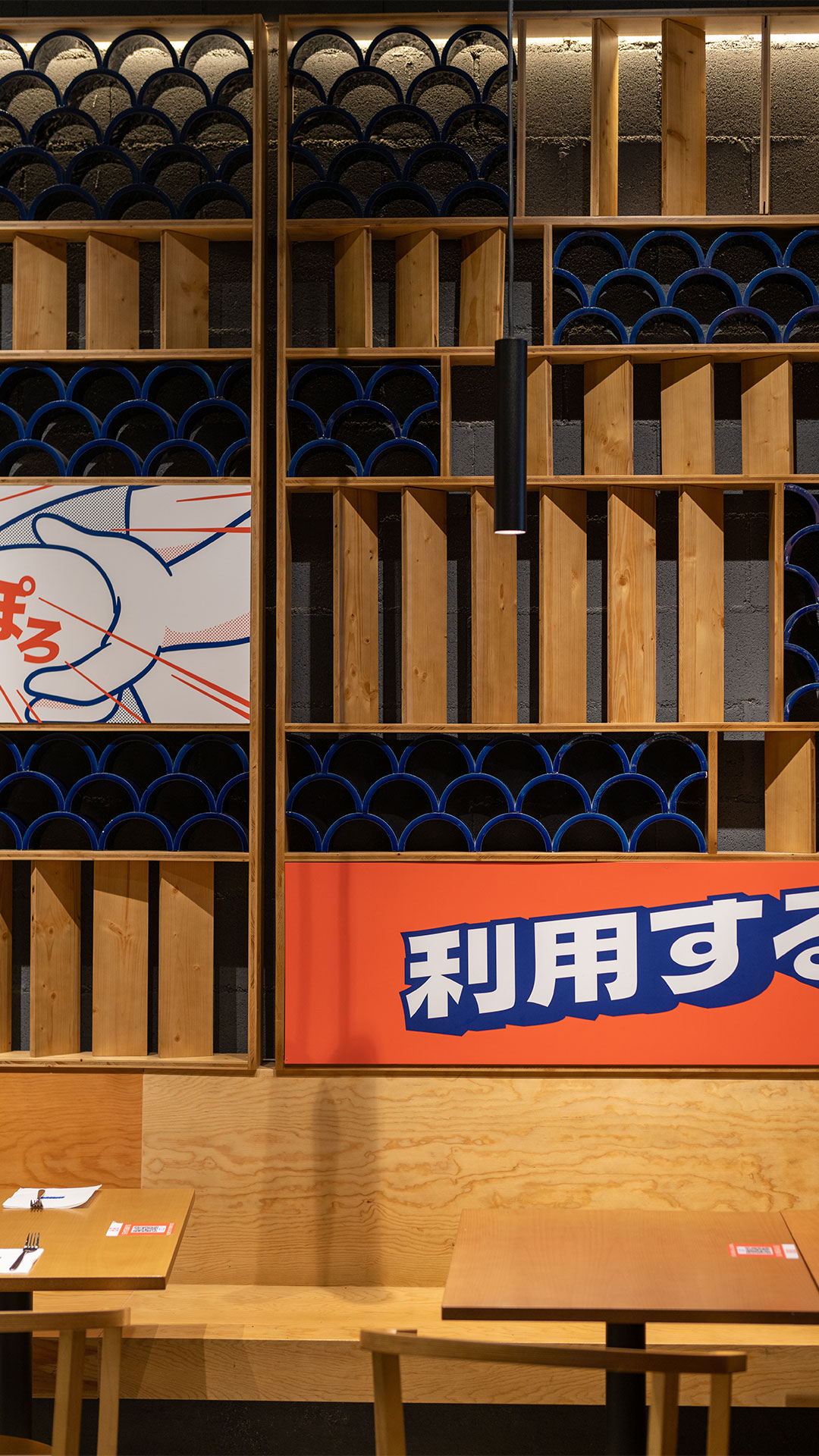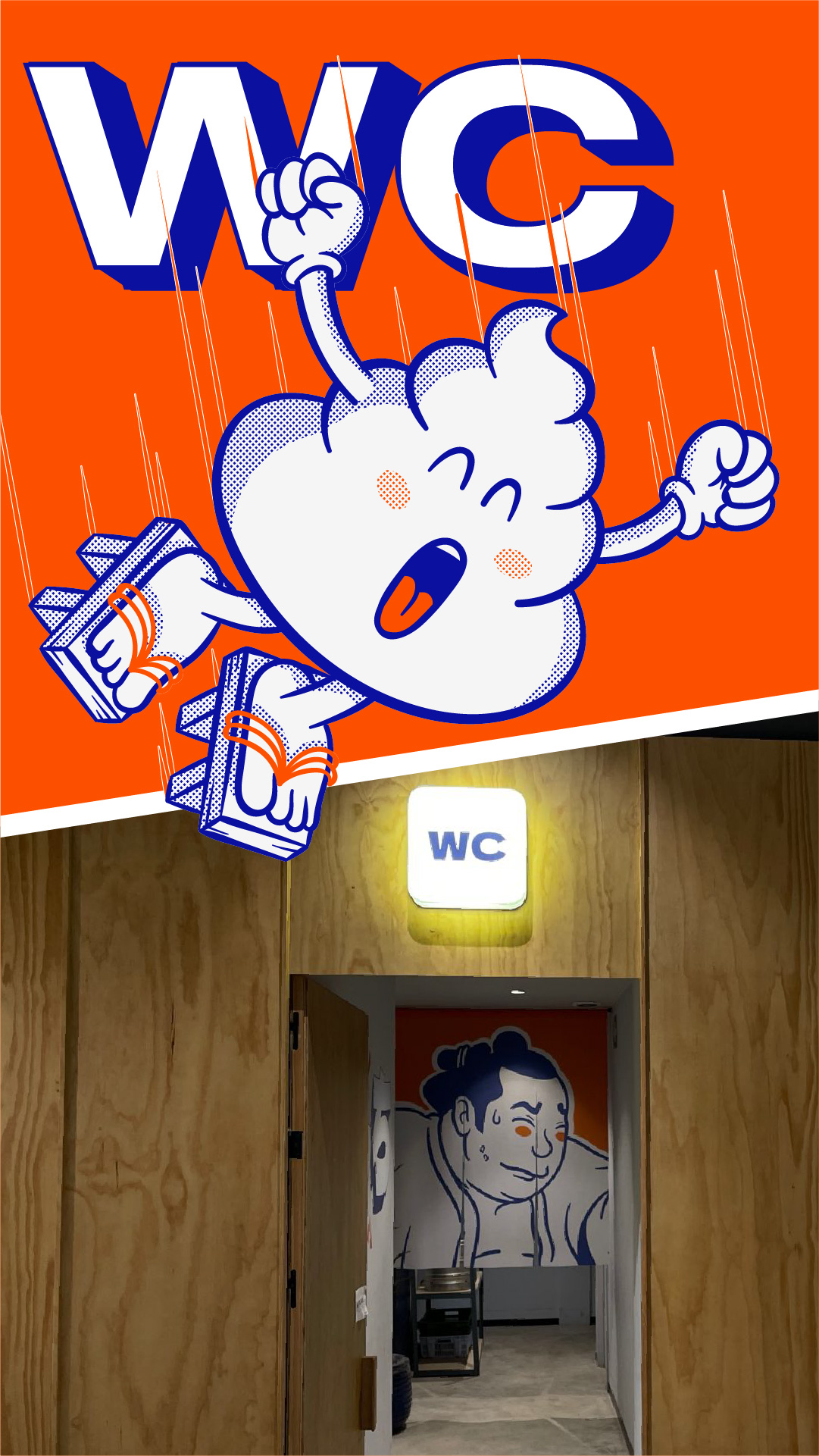 El branding escénico recorre el espacio con grafismos inspirados en el imaginario japonés de cómics y animación. Personajes antropomorfos, guerreros imaginarios, monstruos y luchadores de sumo conviven con dibujos de platos e ingredientes, todos cargados de humor y personalidad, generando un universo propio donde la marca se siente reconocible y única desde el primer vistazo.